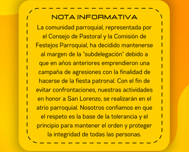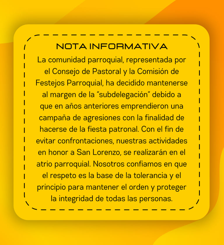 La comunidad parroquial representada por el Consejo de Pastoral Parroquial y la Comisión de Festejos de la Parroquia, ha decidido no tener relación alguna con "subdelegación", debido a agresiones y provocaciones para hacerse de la fiesta patronal propia de una comunidad de fieles.